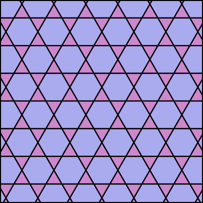 Dabei ergibt sich, dass jedes vierte Hexagon (in der Zeichnung grau statt farbig) sowie ebenfalls jedes vierte gleichseitige Verschnitt-​Dreieck (in der Zeichnung weiss statt farbig) von einem kontinuierlichen Umlaufsinn umgeben ist. Das Muster besteht aus folgender Kachel: