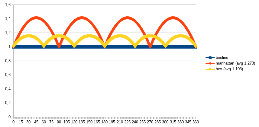 Ein grosser Vorteil dieser hexagonalen Anordnung ist natürlich, daß Weglängen meist sehr viel besser dem Luftlinien-​Ideal entsprechen. Nimmt man an, daß die Richtungen von zurückzulegenden Wegen gleichverteilt seien, ergibt sich unter Vernachlässigung von Zuführung auf das Raster dieses Bild: