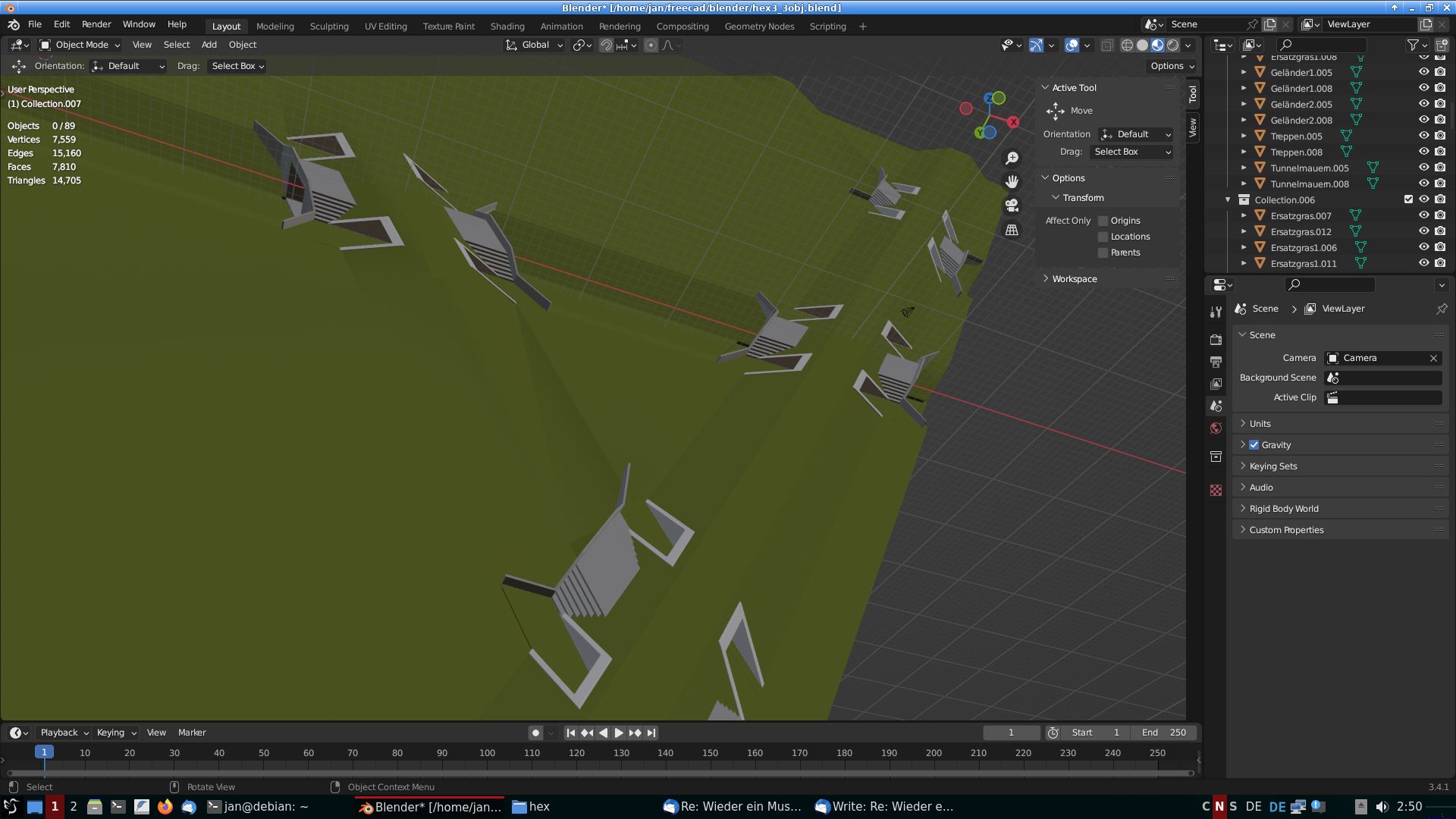 Zweckmässig wäre dann noch, auch für Fussgänger gesonderte Über- und Unterführungen einzurichten. Es entstünde ein Betonbedarf, der allerdings in einem Verhältnis zur Bebauung stünde, für die die Stassen ja letzlich eingerichtet werden. In der obigen Zeichnung (Rastermass gegeben als Seitenlänge der Dreiecke: 50m), entfallen bspw. auf eine Brücken-​Kreuzung 2 Häuser (15mx10m: 4er MFH).